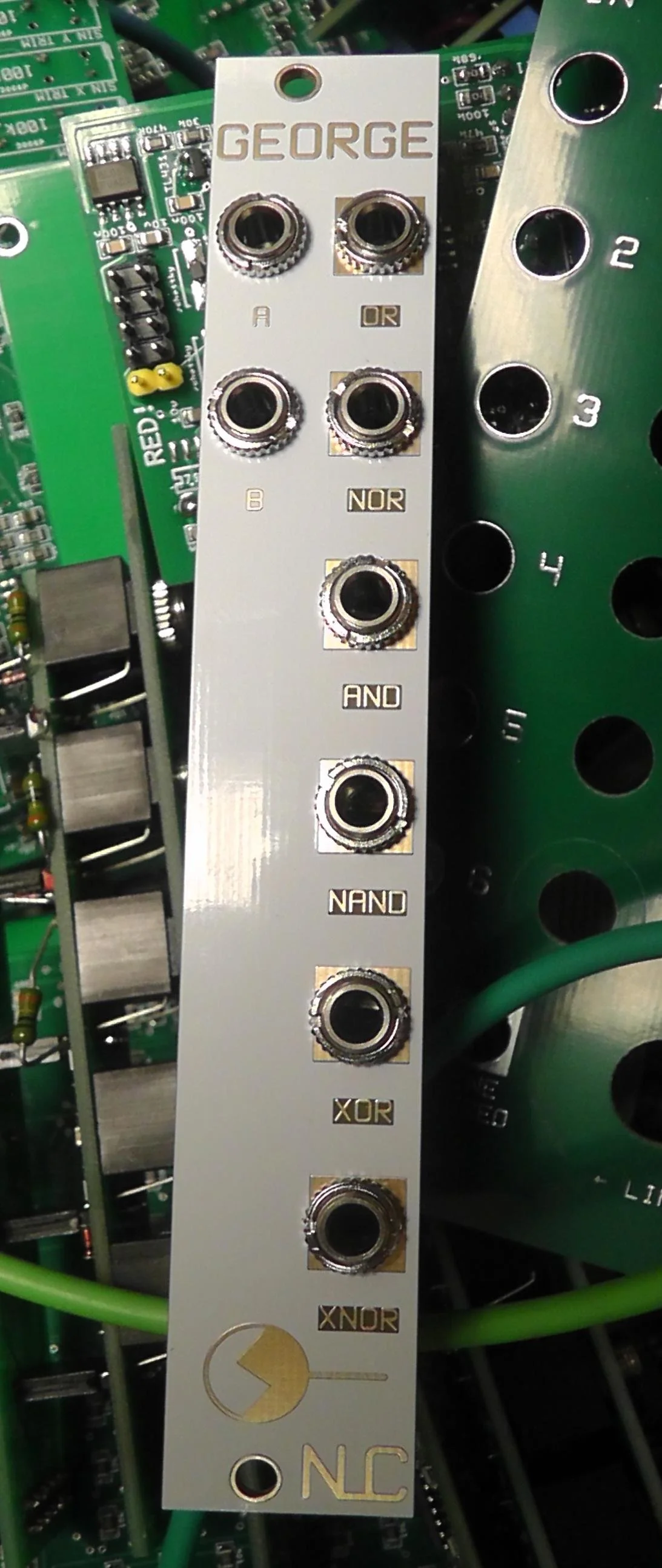George is a Boolean logic module which can supply 6 different logic functions from the two inputs – OR, NOR, AND, NAND, XOR & XNOR.